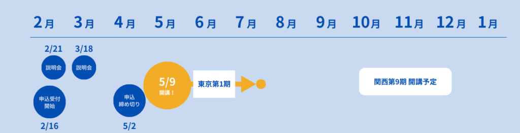 関西と東京の2拠点に展開!それぞれの拠点で1年に1回開講いたします。2026年度は、5月から東京で〈第1期〉を開講、秋から関西大阪梅田で〈第9期〉(いずれも全6回)の養成講座本講座を開講予定です。