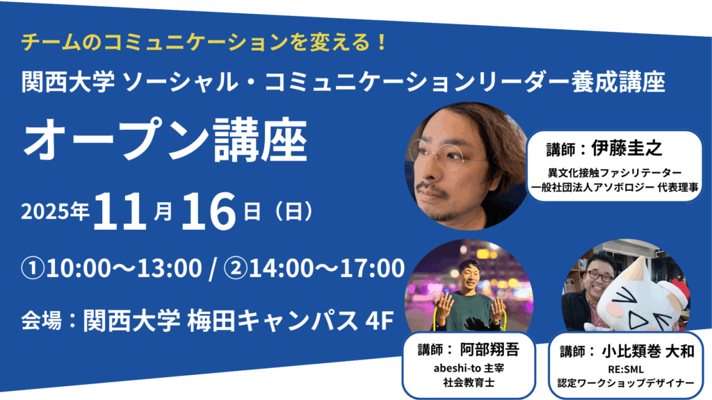 現在開講中の「関西大学ソーシャル・コミュニケーションデザイナー養成講座〈関西第8期〉」の講義を、11月16日(日)に一般公開いたします。